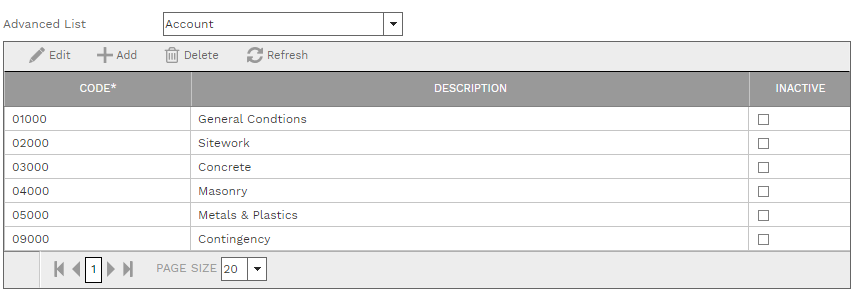 Account - The Account field appears in the Costs/Budgets/Cost Codes page and is commonly used to map one or more costs codes to a general ledger account used in a third party accounting system. When data is sent from PMWeb to the accounting system the Account metadata can be sent along with the PMWeb cost code. The table also includes an Inactive checkbox field. Inactive values will not appear in the Account dropdown list. The account list contains two columns: