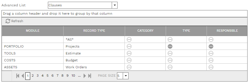 Clauses - Each clause in Portfolio/Lists/Clauses contains Category, Type, and Responsible fields, defined by record type. To streamline the creation of values for these lists they are grouped together by record type in this table. To define values for one of these lists: