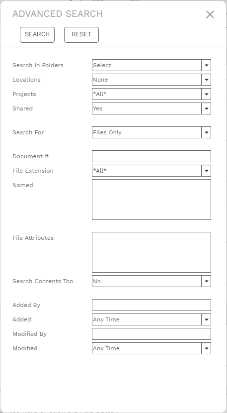The Quick Search Control (see Document Manager) lets you quickly search all folders for text in the IDs and names of files. For greater control of search criteria, use the Advanced Search Dialog. This dialog is opened by clicking the Advanced Search button in the header toolbar of any Document Manager folder. Results for quick searches and advanced searches are shown in the Search Results Page. Note that some searches - when field by field granularity is important - are best done from the Manager Page. Parameters are linked by the AND operator to build your search statement.