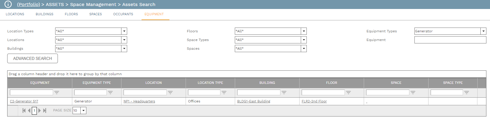 Read only. Use filtering, sorting, and grouping to find an equipment record and then click the Equipment, Location, Building, Floor, or Space hyperlink to navigate to that record. You can also click the icon to open the floor plan in the PMWeb Viewer. (See Floors for information about uploading a floor plan.)