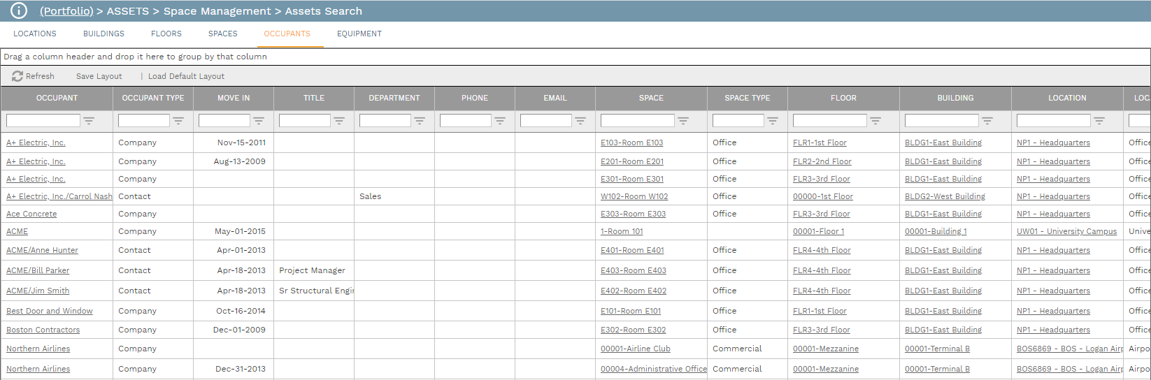 Read only. Use filtering, grouping, and sorting to find an occupant and then click the Occupant, Floor, Building, or Location hyperlink to navigate to those records. You can also click the icon to open the floor plan in the PMWeb Viewer. (See Floors for information about uploading a floor plan.) See Spaces for information about occupants.