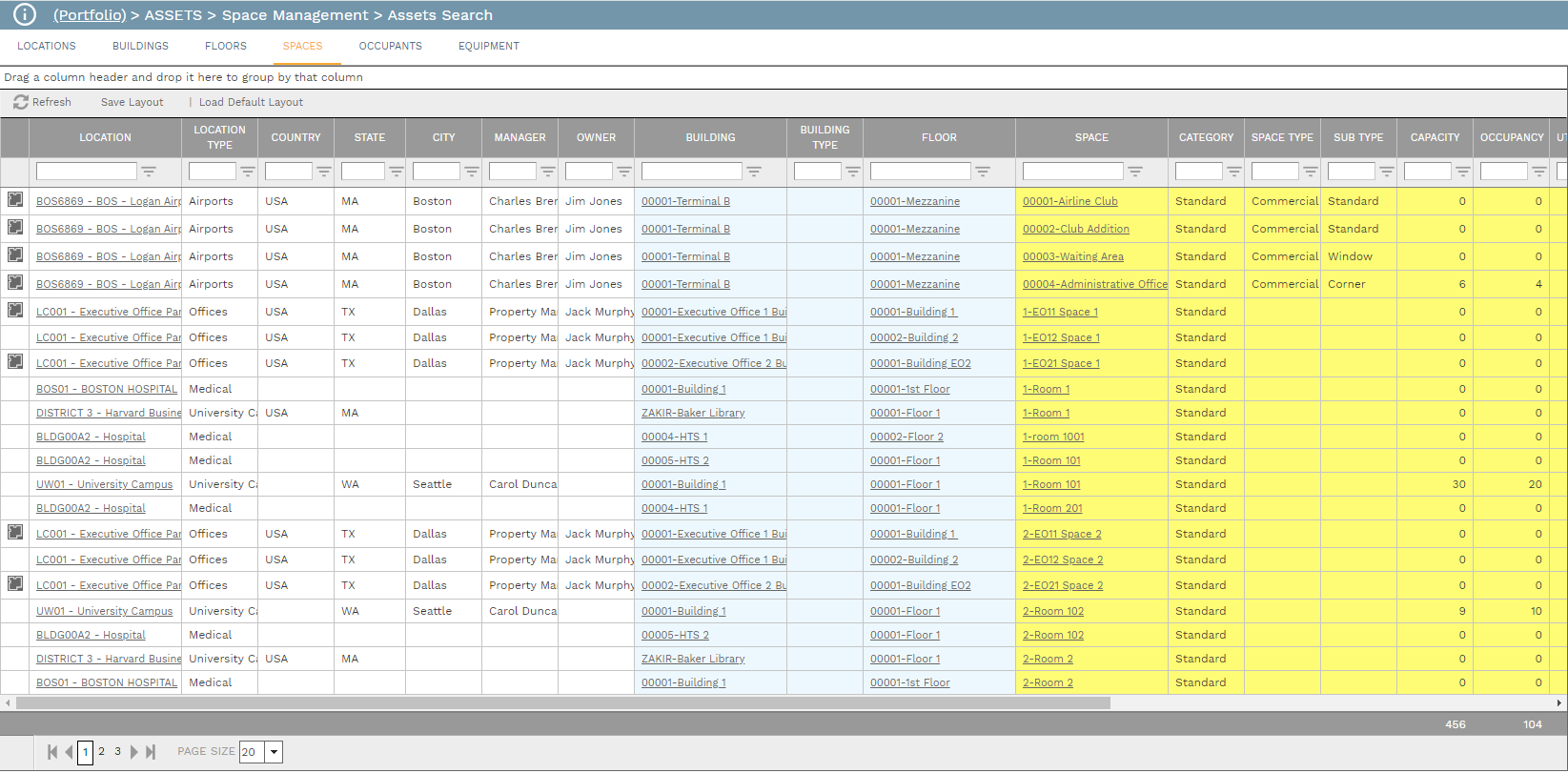 Read only. Use filtering, grouping, and sorting to find a space and then click the Space, Floor, Building, or Location hyperlink to navigate to those records. You can also click the icon to open the floor plan in the PMWeb Viewer. (See Floors for information about uploading a floor plan.) Fields highlighted in yellow display calculated space planning data. See Spaces for more information about space planning.