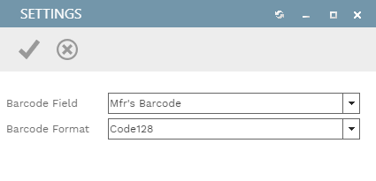 Because Items each have two barcode fields - "PMWeb Barcode" and "Mfr's Barcode" - you must specify which field you are searching using the Barcode Field. Next, select a Barcode Format. Click the OK button to save your selections and close the dialog. Your settings will be remembered until you change them.