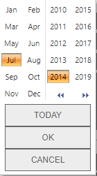 Click a month and year to select them, then click the OK button to close the selector and update the calendar view or click the Today button to update the calendar.