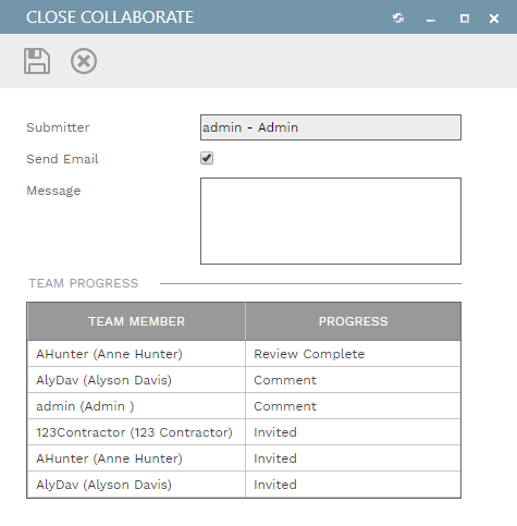 Message Field - The message here will appear in the Collaborate Tab and can, if included in the template, appear in the email message sent to team members when the Save button is clicked. See Message Templates for information about configuring the Close Collaborate email template.