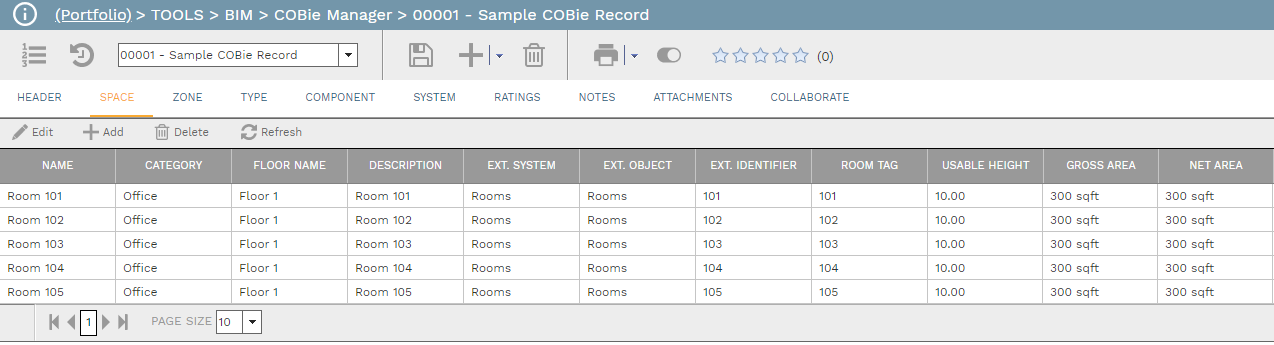 Space, Zone, Type, Component, and System Tabs - Use these tabs to edit and display data from the standard COBie categories. Here is a sample Spaces tab: