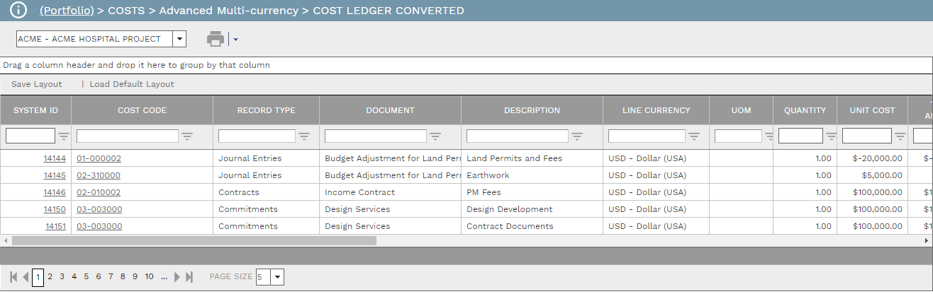 Each time a transaction in the Cost Ledgers is edited and saved additional data - cost ledger converted data - is automatically created as well. The cost ledger converted data is the total amount of each line in the cost ledger converted into every currency in the system using the currency settings of the original transaction. The exchange rate used in the calculation and the converted amount is displayed for each currency. By converting and storing all possible conversions as records are updated PMWeb can retrieve and display conversions very rapidly on system screens and in reports and queries.