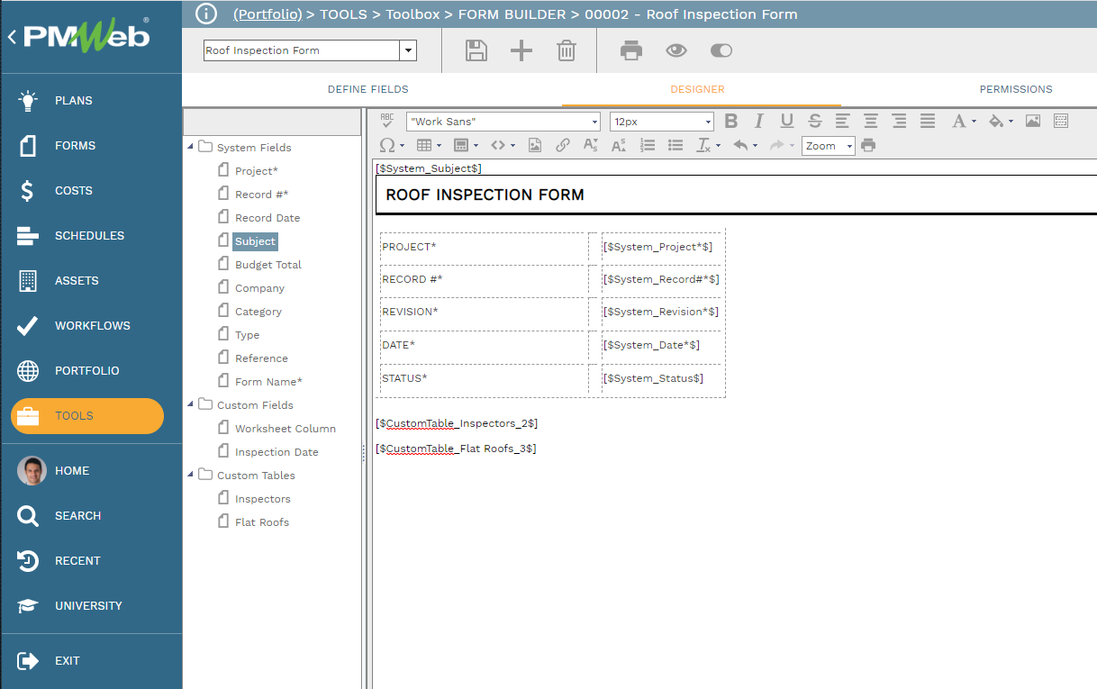 Use this tab to configure the layout of your form. You can use tables to organize your controls or place them anywhere in the design field. Place your cursor in the design field and then click a data control token in the tree on the left side of the tab. Use the toolbar buttons to configure colors, formats, etc.