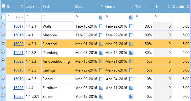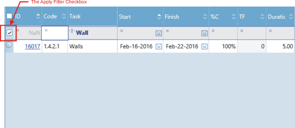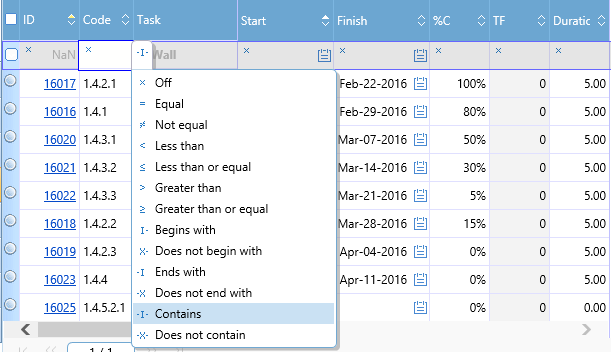 Use these fields to filter tasks that show in the Gantt control. To create a filer click in one of the filter fields and type or select an entry. You can click the small symbol in the upper left of the filter field to select the filter parameter (if you want to use something other than the default parameter.) You can also use the parameter list to toggle a single filter off by selecting the choice in the list: "x Off".