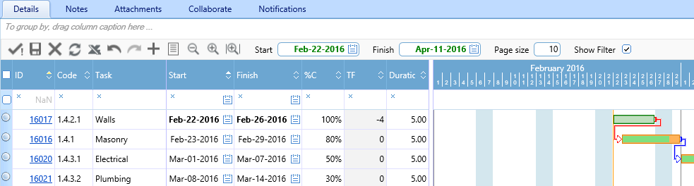 To view and edit the details of a task, click the View Details Link. If you left click the link, and if the Display Task Tabs button is toggled on, the task details display in the tabs below the Gantt chart. If you right click the link the Task Details dialog opens.