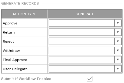 Each workflow action taken can, if you wish, automatically generate a related record. Generated records are bi-directionally linked to the record in Workflow. If the "Submit..." box is checked the generated records will automatically be submitted into Workflow, if enabled for that record type. Records are generated only the first time the step is invoked in the workflow.
