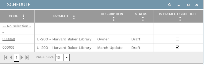 The dialog displays all schedule records for the initiative. Click anywhere on one of the schedule lines to select it and close the dialog. The schedule then appears on the Schedule tab. To unlink a schedule, open the Schedule dialog again and click on the "-- No Selection --" line.