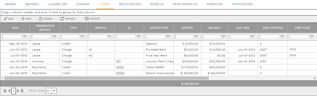 This tab displays all of the currency based transactions related to the lease. Transactions can be added to the tab in several ways: