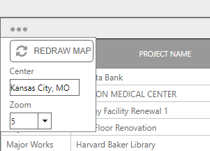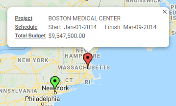 This tab shows a map, which can be configured by each user, with interactive map points representing projects. Map points, when clicked, open a dialog with current schedule and budget hyperlinks.