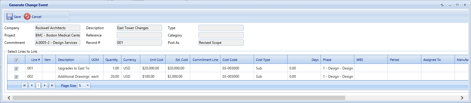 The table displays the lines from the Online Change Request record. Place a checkmark next to each line you wish to send to the change event or change order and then click the Save button. The dialog closes and a new record is created.