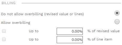 Allow overbilling - If this radio button is selected you will not be allowed to change the status of the record to "Approved" if the amount invoiced exceeds the total revised value of the contract by a percentage greater than "% of revised value" and/or if it exceeds the revised value of any line by a percentage greater than "% of line item".