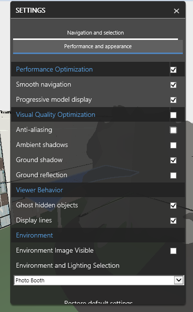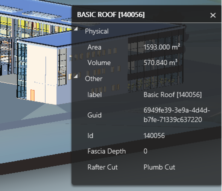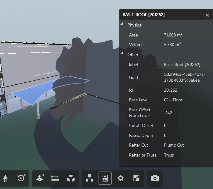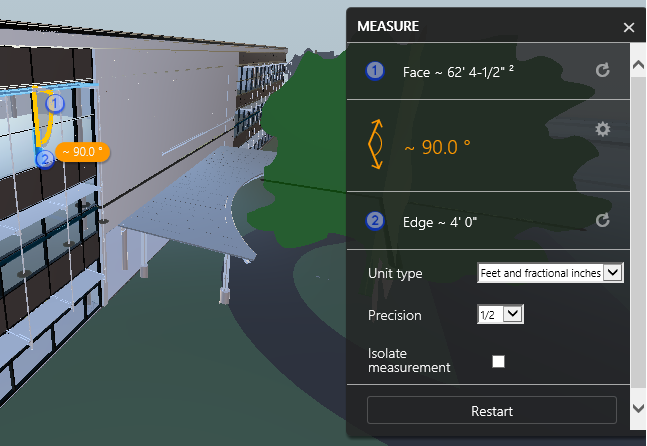 Click an element in the model to view its measurements in the dialog. Click the Settings button to open the settings panel. Select a Unit type and Precision. The Isolate measurement checkbox hides all elements of the model except the one being measured. Click the Close button to dismiss the Measure Dialog.