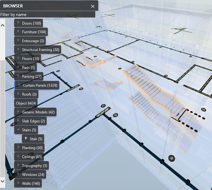 Click this button to open the Model Browser Dialog. The browser displays model elements grouped by family. When you click a family the model view is redrawn as translucent with the elements in that family highlighted. This screenshot shows the model with the "Stair" family selected in the browser: