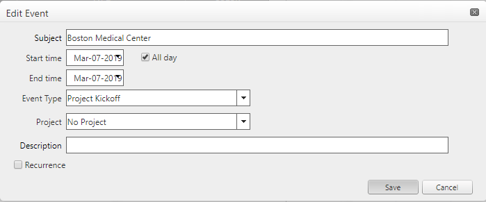 Use this page to view, add, and edit calendar events for individual PMWeb users. The calendar can be accessed from Portfolio/Calendar and can also be displayed in a tab on the User Home Page. Defaults for this page can be configured using Calendar Setup.