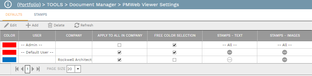 Use this page to create default settings for PMWeb users and/or all users in a company that apply when they interact with PMWeb Viewer records. Settings include the default color of the elements they draw and the stamps they are allowed to use. The settings on the Defaults tab are used as the defaults for all new PMWeb Viewer records but may be edited within the record. The Stamps tab is used to upload and manage the image stamps that are available to be used in PMWeb Viewer records.