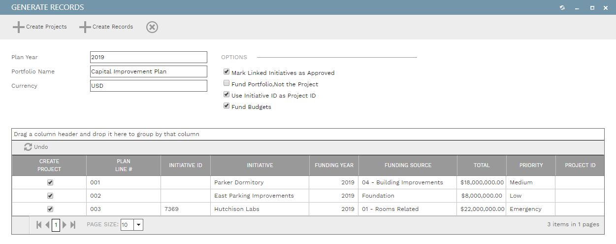 To create Budgets and Funding Records - select one or more lines in the table using the Create Records checkbox and then click the Create Records button