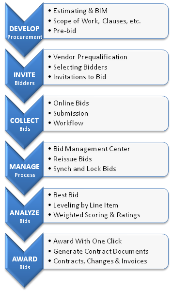 The graphic below illustrates a typical procurement and bidding process. Each of these tasks, and many more, can be accomplished using the PMWeb procurement features. All of the steps are easy to carry out and are seamlessly integrated with one another.