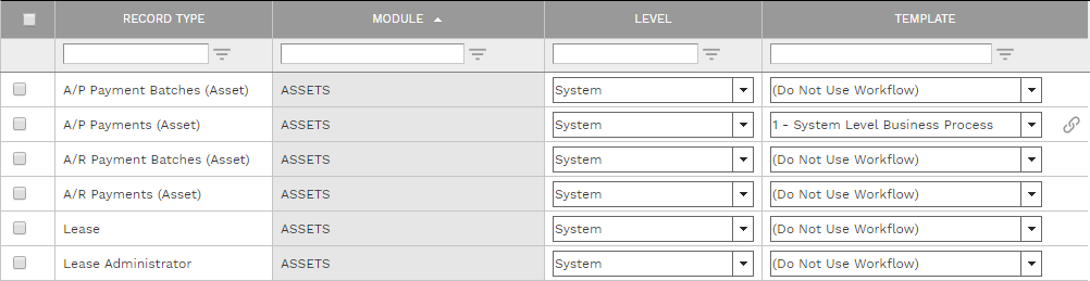 Template Field - The choice in this field determines what will happen for every record of the record type for the selected level. The options that appear in this list will vary, depending on the selected level, the record type and