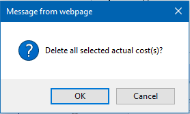 Delete Actual Costs Button - This button removes all selected actual costs from the requisition. It does not delete the original actual cost record - it frees them up to be re-linked to this requisition or another one. Clicking this button opens a confirmation dialog: