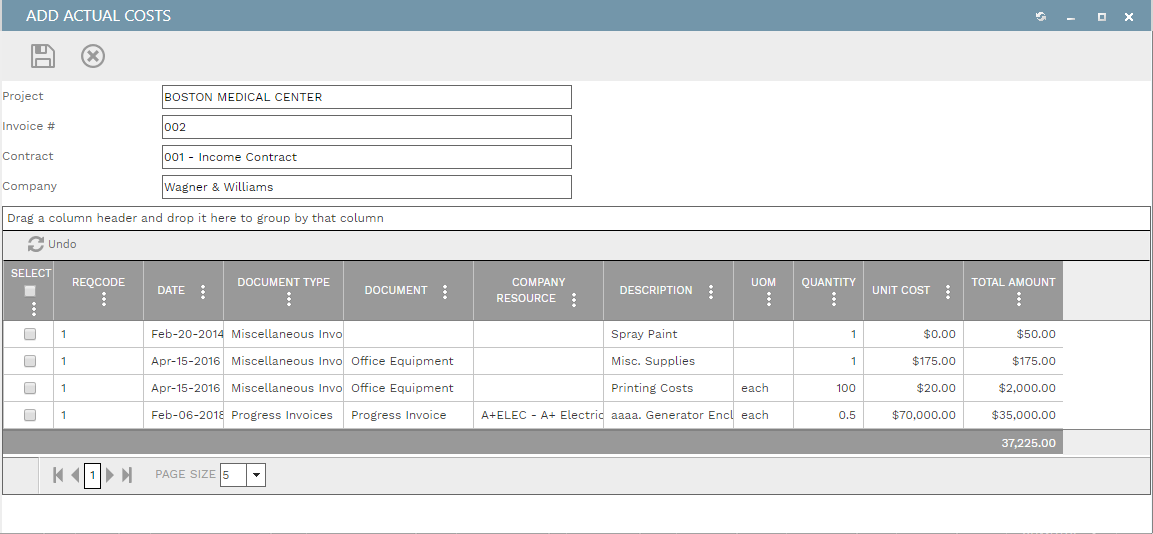 Place a checkmark in the Select field for each actual cost line you wish to add to the requisition and then click the Save button. The dialog closes and the selected lines are added to the table.