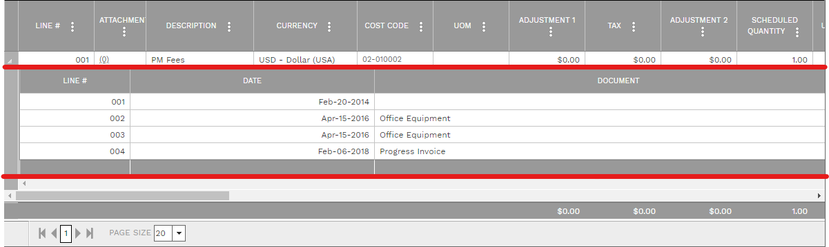 This sub-table displays the actual costs linked to by Req. Code to each line in the Details table. Lines are added to the sub-table using the Add Actual Costs button and are removed using the Delete Actual Costs button. All lines in the sub-table are read only.