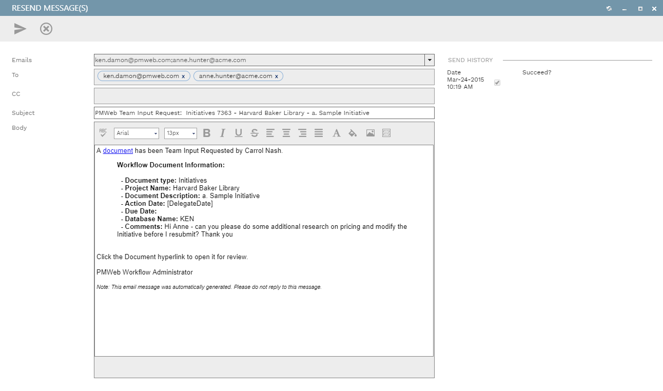 This dialog opens when you click the Resend Message(s) buttons in the Workflow Tab Workflow Log Toolbar or in the Collaborate Tab. Use the dialog to view and resend messages created by PMWeb Visual Workflow or Collaborate processes. The Send History section displays each date and time that the message was sent.