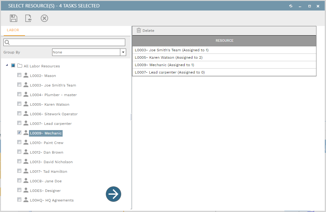 This is a special version of the Select Resources Dialog. The title bar shows the number of currently selected schedule tasks. When the dialog opens all of the resources that are currently assigned to any of the selected tasks automatically display in the Resources table on the right. After each resource, in parentheses, is the number of the currently selected tasks the resource is assigned to. To assign a resource to all of the selected tasks, drag them from the tree on the left and drop them on the table on the right and then click the Save or Save & Exit button. Notice that when you add them to the table, their "(Assigned to ___)" is 0 and will stay that way until you click the Save or Save & Exit button. To unassign a resource from all of the selected tasks, select them in the Resources table, click the Delete button, and then click the Save or Save & Exit button.