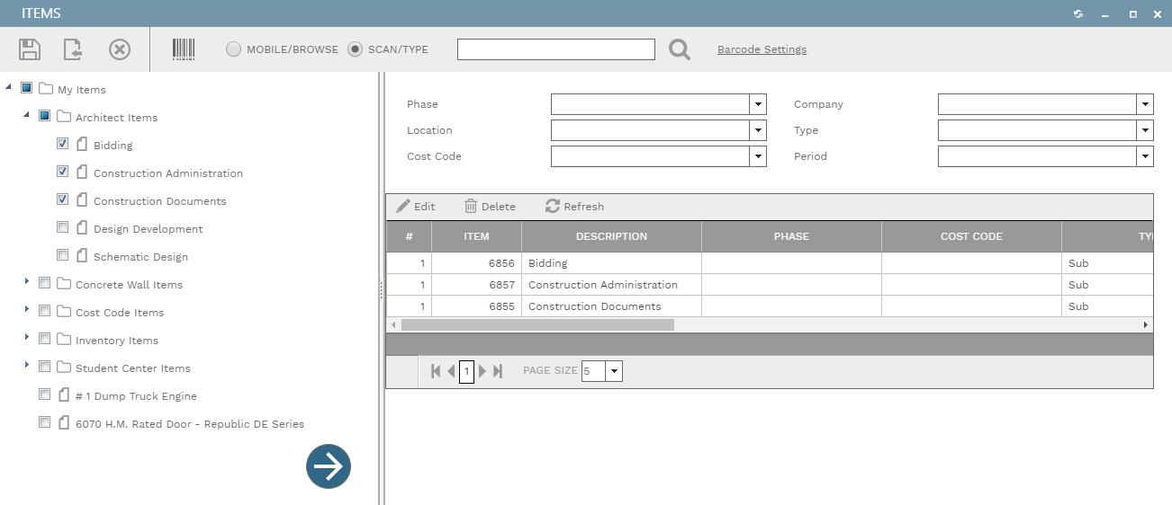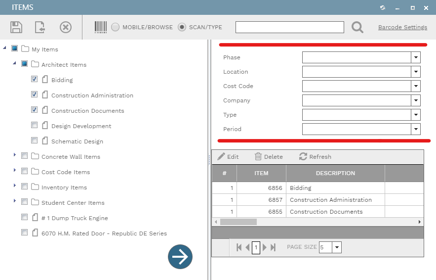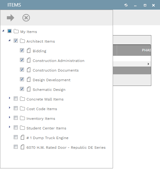 Some dialogs, when opened on devices with small screens, reformat themselves to keep all of their functions available. Here, for example, is a screenshot of the Items dialog, as it appears on a desktop PC. You drag items from the tree on the left and drop them on the table on the right. Or, check the box next to one or more items in the tree and then click the floating arrow button to copy them to the table. Above the table are two columns of fields that act as defaults for the selected items: