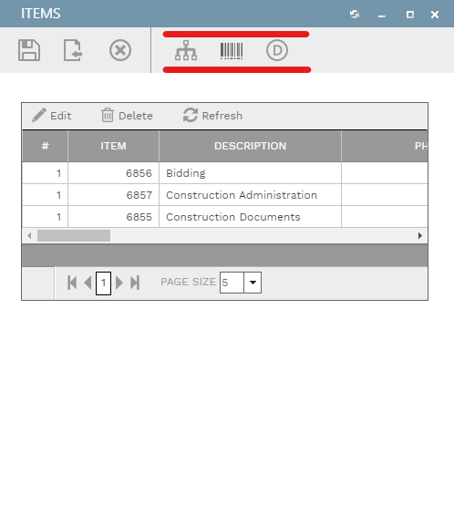Toolbar buttons open the overlays for, in this example, the items tree, the barcode search, and the default fields.
