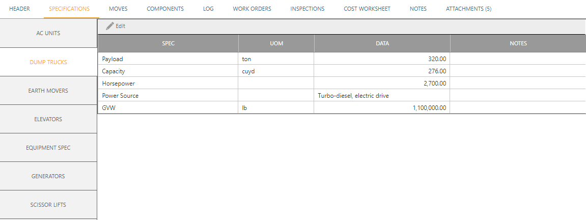 A sample Specifications tab within an Equipment record. The sub-tabs shown - AC Units, Dumptrucks, Earth Movers,... - are created by defining them in the Tabs Table and then assigning custom fields to them in the Custom Fields Table.
