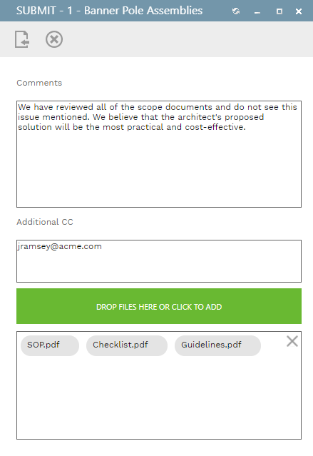 This dialog is opened by clicking the Submit button in the Header Toolbar.