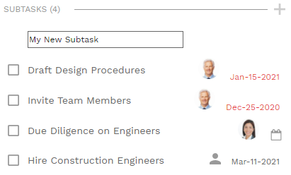 Every task can have an unlimited number of subtasks. Each subtask can contain as much data as its parent task. This allows you to create custom checklists of deliverables for all tasks. Note that only the top level task in a subtask chain appears in Card View and List View.