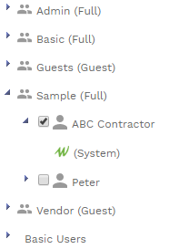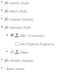 Note that dropping higher levels on users replaces what is displayed in this tree. For example, in the screenshot above the user "ABC Contractor" currently has access to two projects (Boston Medical Center and Pinnacle Tower) and All Locations. The screenshot below shows ABC Contractor after we grant them a higher level of project permission, All Projects Programs: