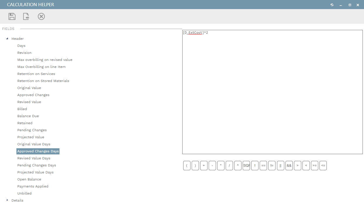 Fields Tree - This tree lists some of the header and details fields from the selected record type. Insert them into the calculation field by clicking on them here.