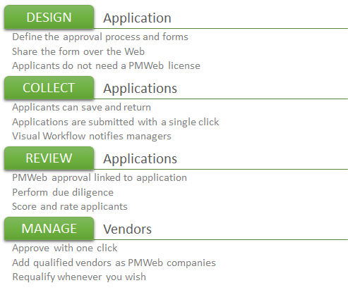 Vendor Prequal is seamlessly integrated with the other PMWeb modules, and provides easy to use features for you to define and create vendor approval forms, and to publish them on your PMWeb site to pre-qualify vendors. Vendor Prequal enables you to manage the following tasks.
