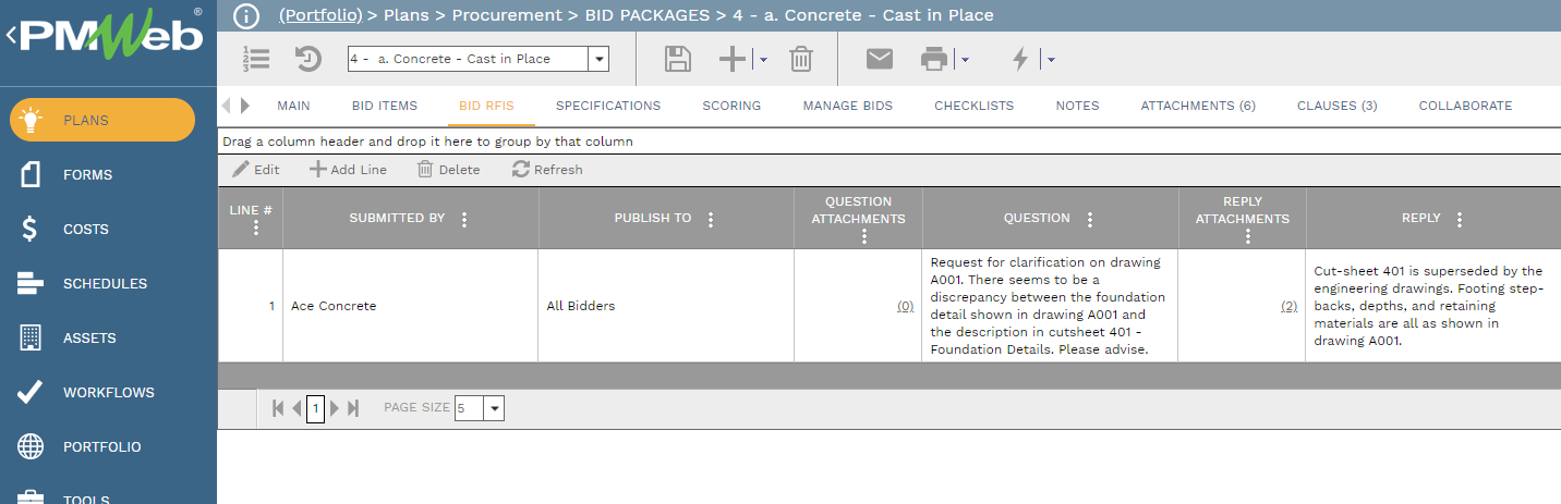 The Bid Contact or other administrator opens the Bid Package, clicks on the Bid RFIs tab, selects one or more questions, and then clicks the Edit button. The selected lines open for editing.