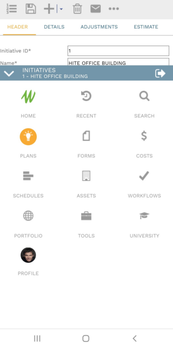 The control panel is the main menu of PMWeb. Its buttons allow you to navigate to various features of the platform. The control panel can be viewed in an expanded state (called a drawer) or collapsed into a more compact view (a rail). The buttons that appear on the control panel vary, depending on which features are licensed and which features the user has security access to. For very small screens (a phone in portrait mode, for example) the control panel becomes a bottom drawer that can be viewed by clicking the expand button at the bottom of the screen.