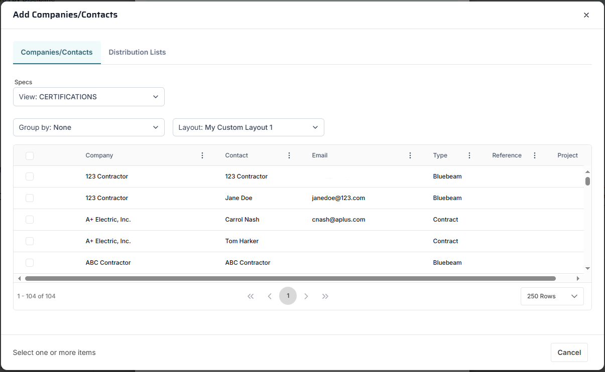 ![]() If you open the dialog from a contact field the "Contact" column appears in the table, along with the Company. A special feature of this tab is the Specs dropdown in the toolbar. Select one of the Specifications associated with companies to display those user defined fields in the table. Check a line in the table and then click the Save button to insert it into the record.