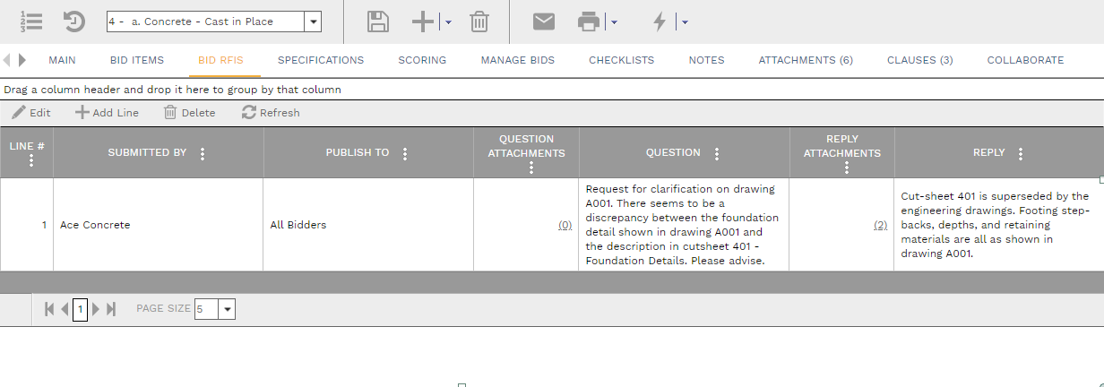 The Bid Contact or other administrator opens the Bid Package, clicks on the Bid RFIs tab, selects one or more questions, and then clicks the Edit button. The selected lines open for editing.