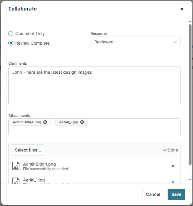 A line will be added to the Collaborate log, including comments you entered and attachments you added