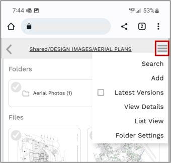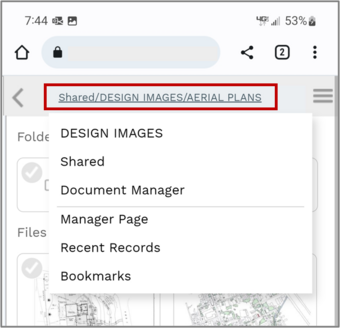 In the desktop view of Document Manager, clicking each segment of the breadcrumbs navigates to a different folder. In mobile view, tapping the breadcrumbs opens a dropdown menu.