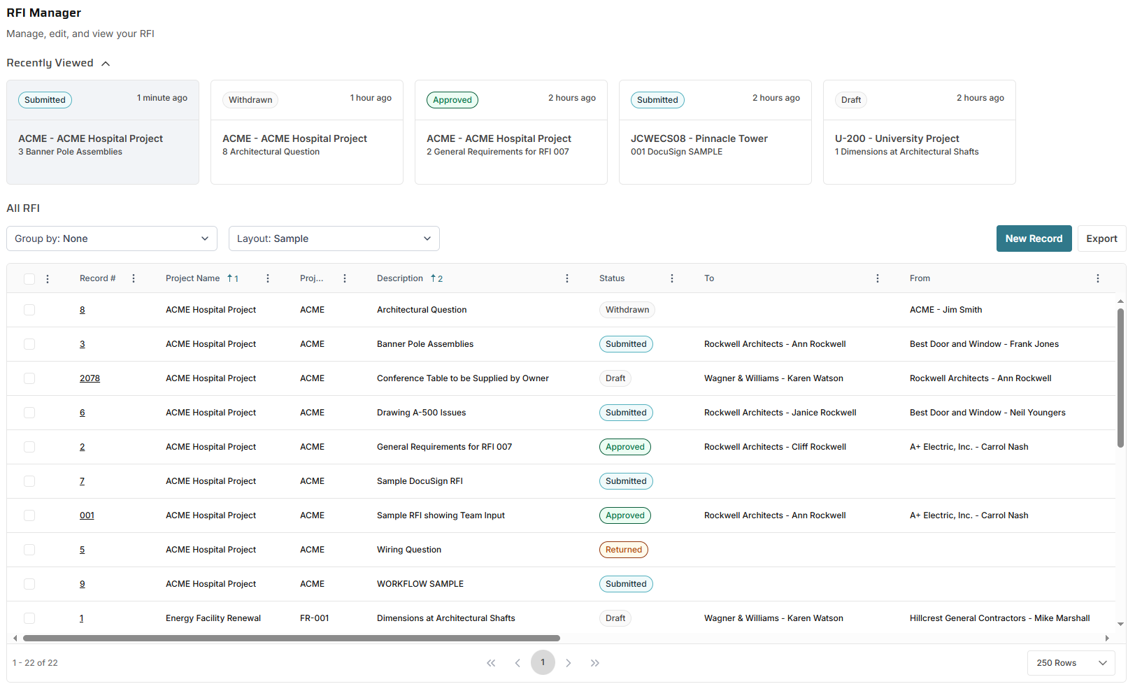 View recent records - When you click the View Recent button, the manager page table is refreshed to show the last 10 records that you opened of that type. All other filters are temporarily removed. Click "View All" to return to the previous view.
