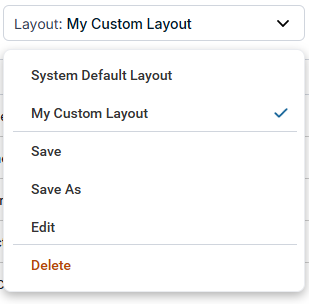 The top section of the dropdown shows all of the saved layouts for the page, including the System default layout, which is always at the top of the list. (The System default layout cannot be edited or deleted.) The currently loaded layout is highlighted. If you have system permission to edit the currently loaded layout, the bottom section of the dropdown shows Save, Save As, Edit, and Delete buttons. Click the Edit button to open the Manager Page Layout Dialog.