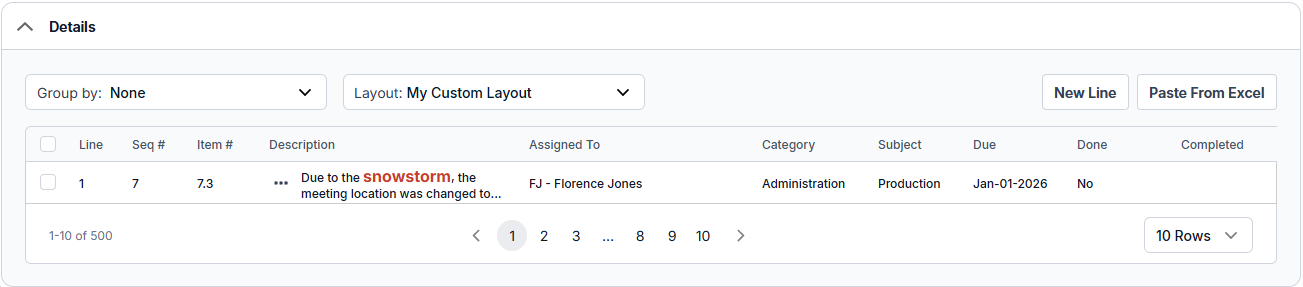 Create Next Button - This button is only visible if the record has a Status of "Approved" and is the highest Meeting # in the sequence. When you click this button a new record is created with much of the header data from the current record copied into the new one. The Meeting # is incremented by one. In addition, lines in the Details Table that are not marked Done are copied to the new record.