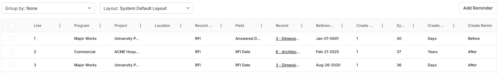 Reminders are date based activities that can be created across the PMWEB platform. In most places, when you right click on a date field, the Define Reminder Dialog opens. When the reminder date is reached, onscreen and email messages are sent to users. The Define Reminders page is used to manage these activities. Reminders from all modules of PMWEB can be edited or deleted, and new ones can be added. See Define Reminders for more information.